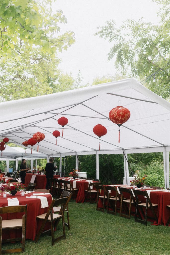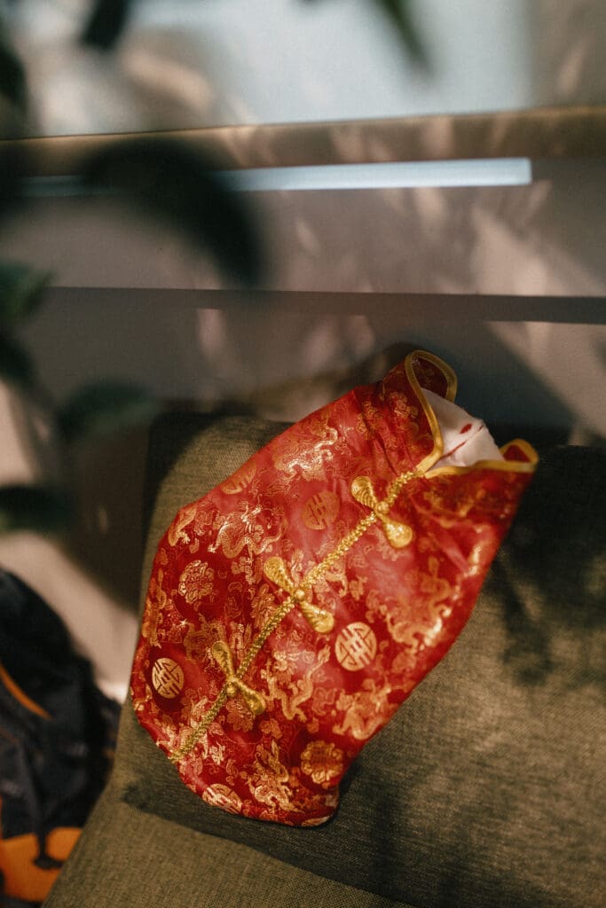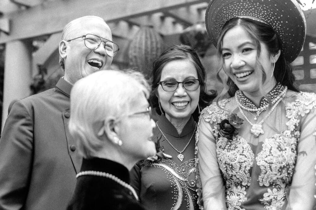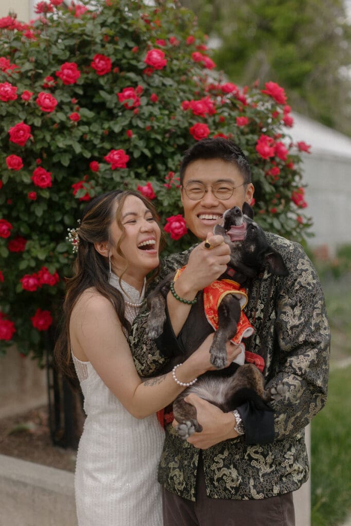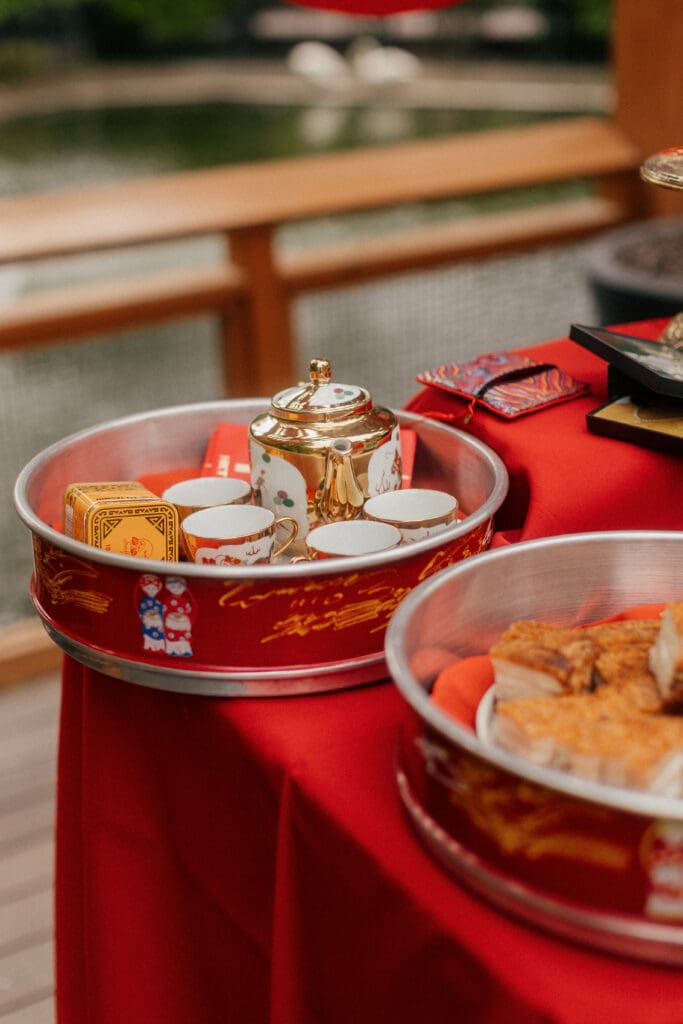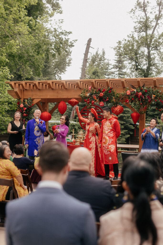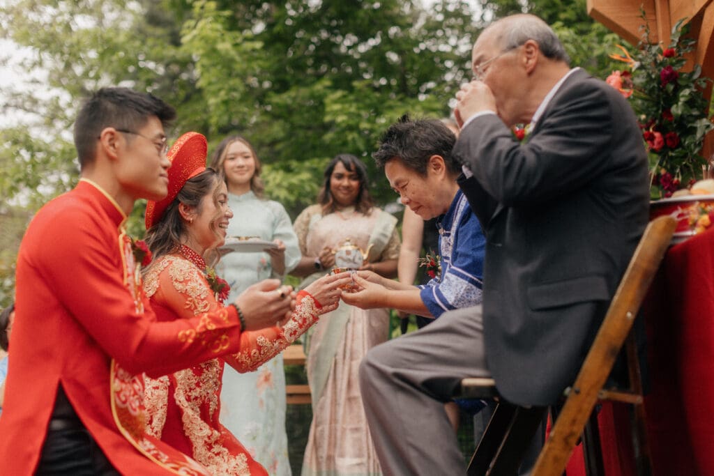 Couple kneeling during their Chinese-Vietnamese tea ceremony at Chase Mill at Tracy Aviary, honoring their parents with traditional gestures of respect.