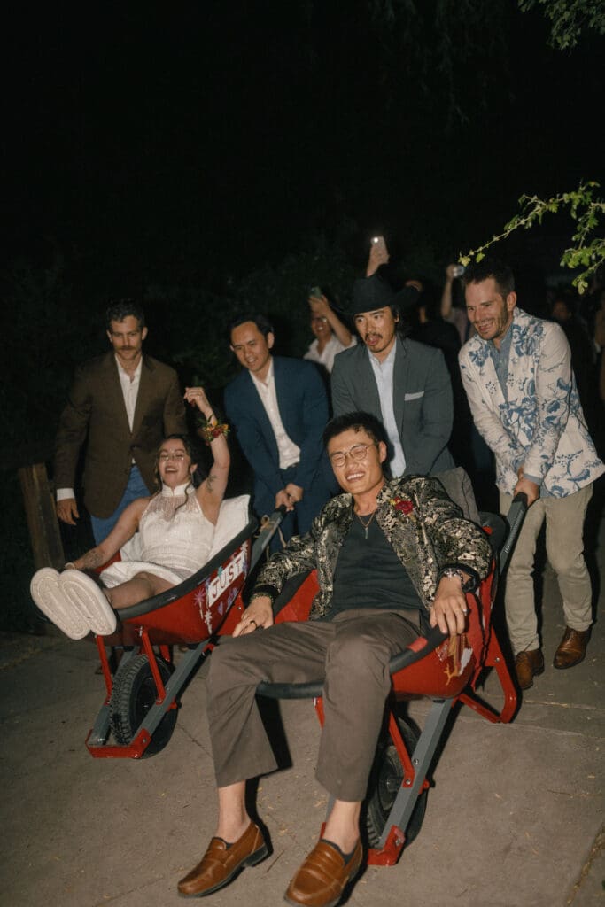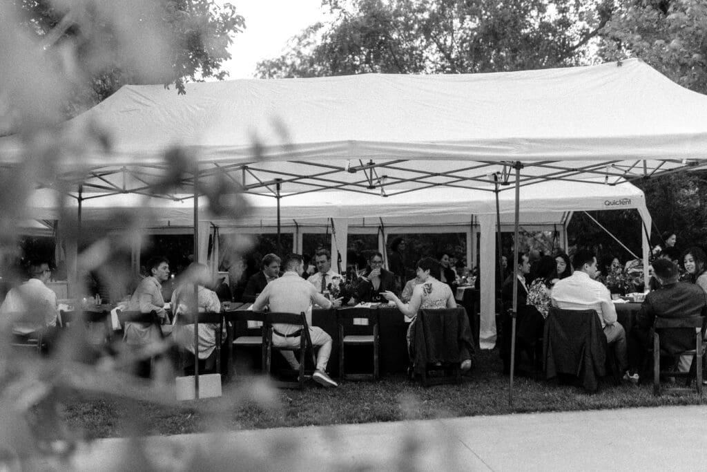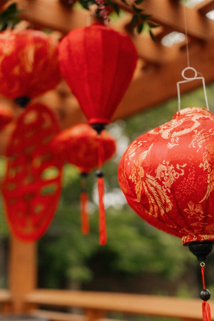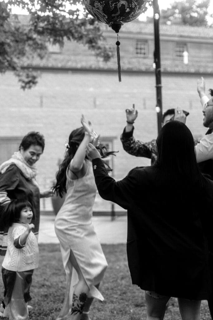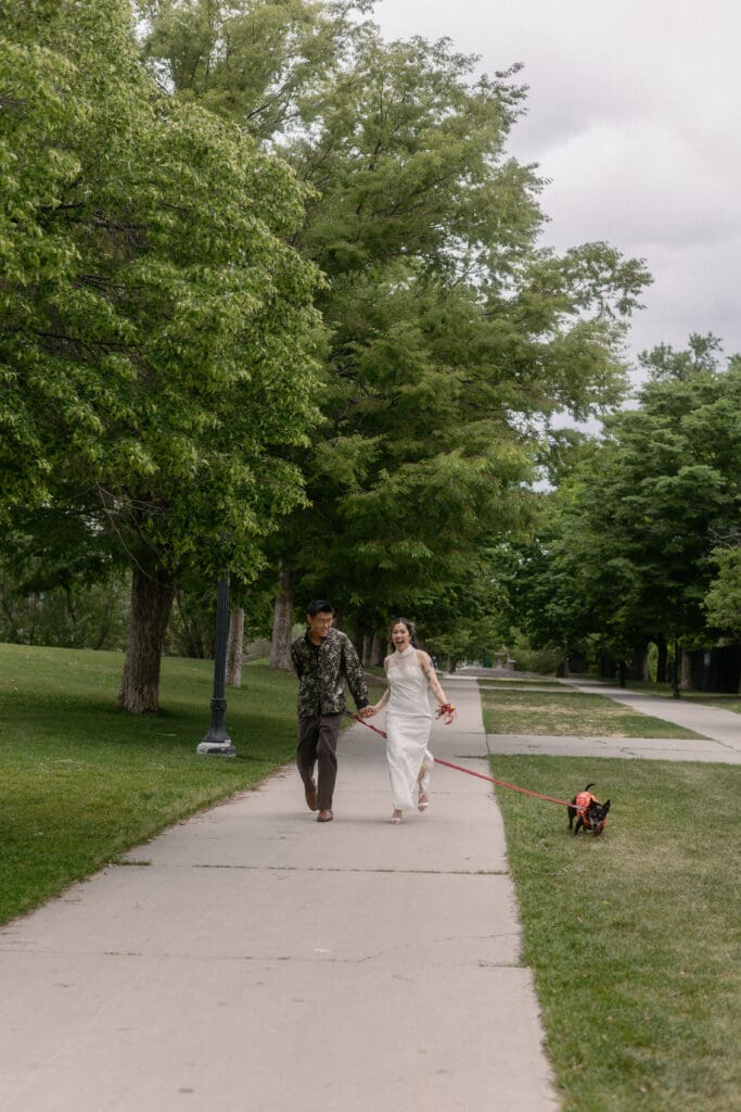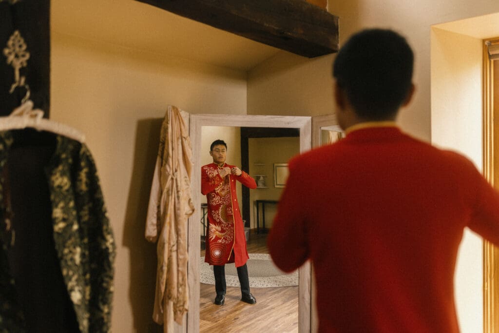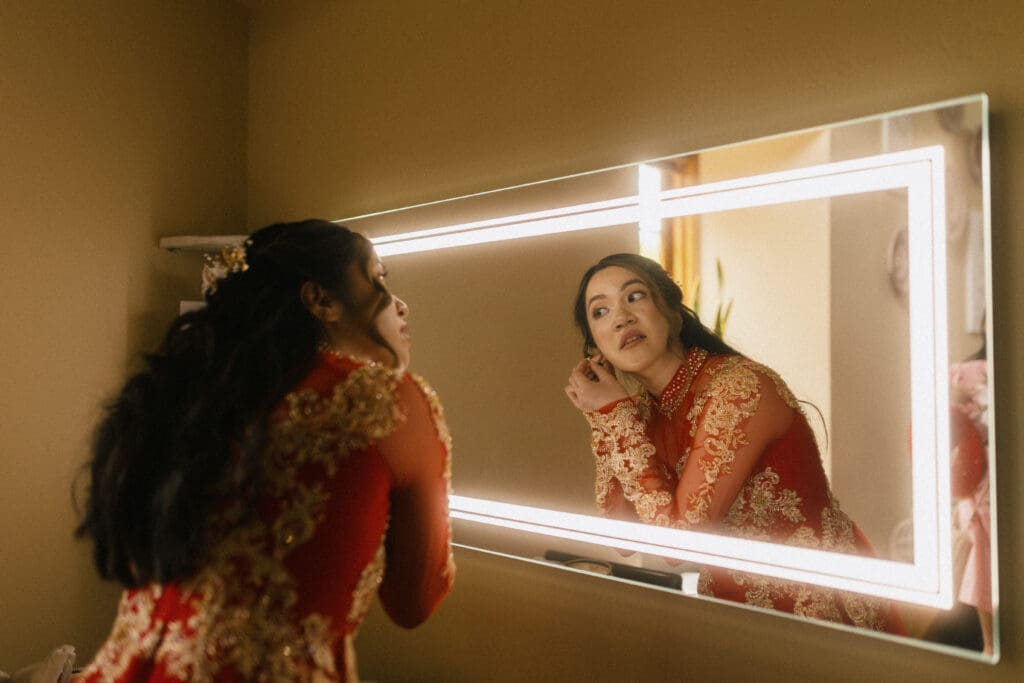 Couple kneeling during their Chinese-Vietnamese tea ceremony at Chase Mill at Tracy Aviary, honoring their parents with traditional gestures of respect.