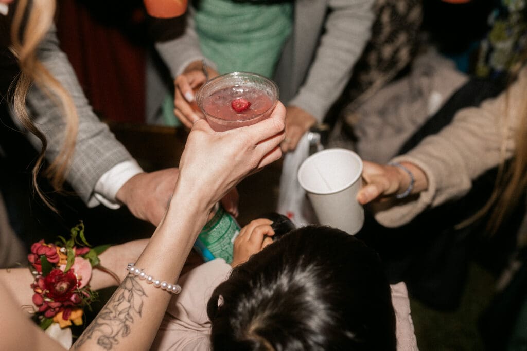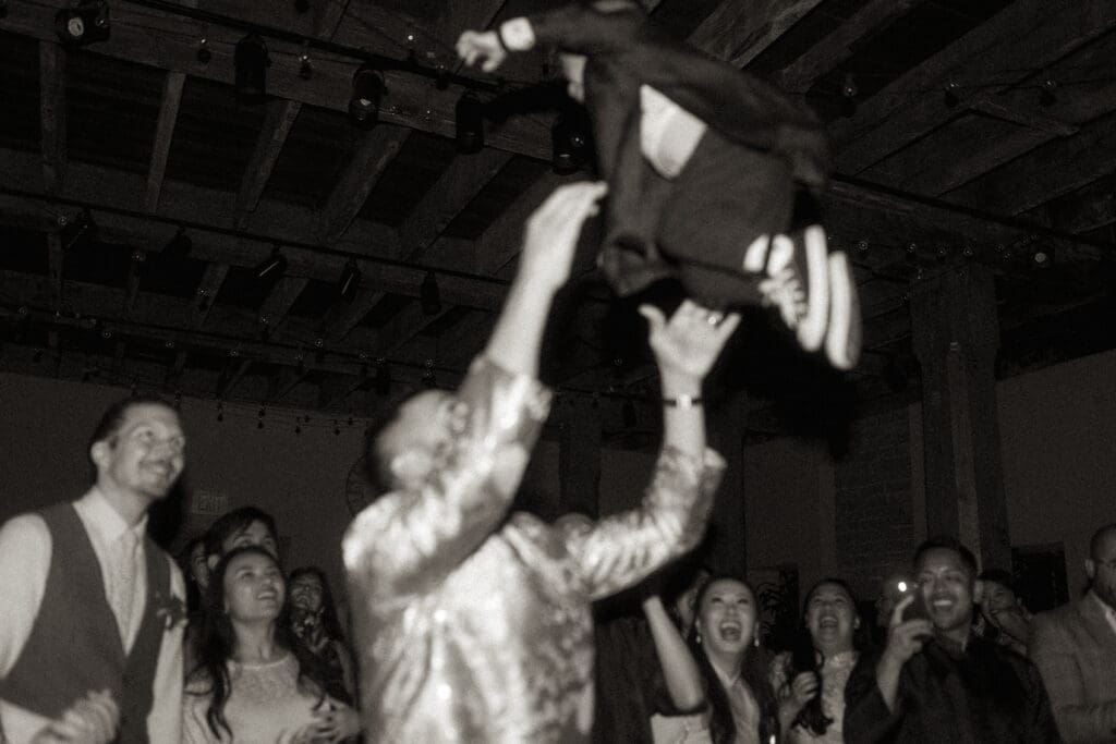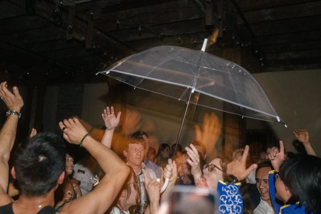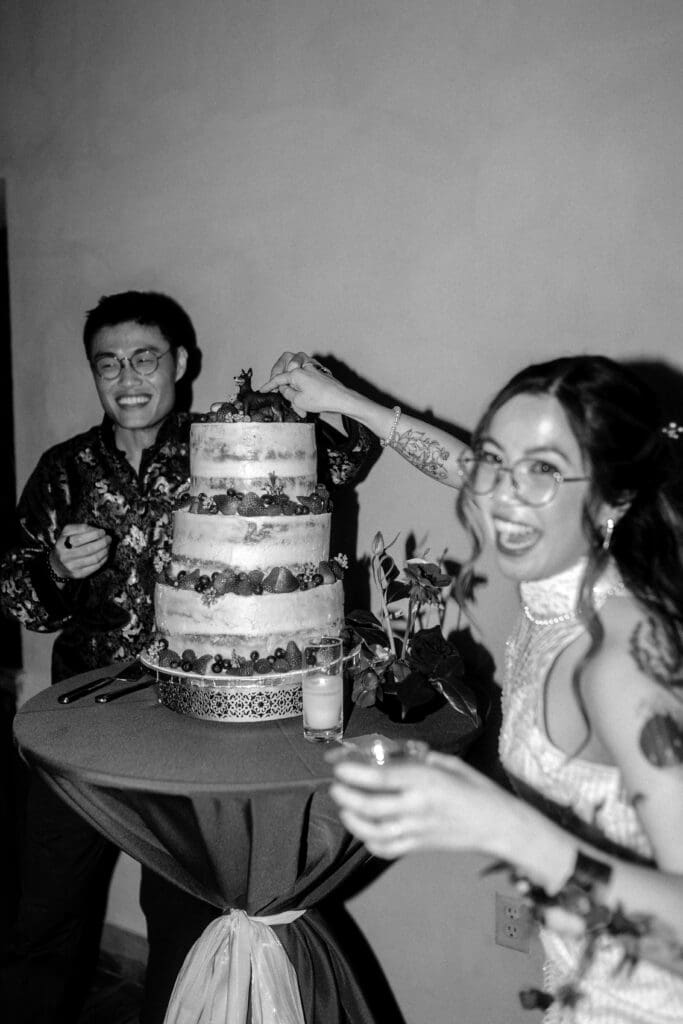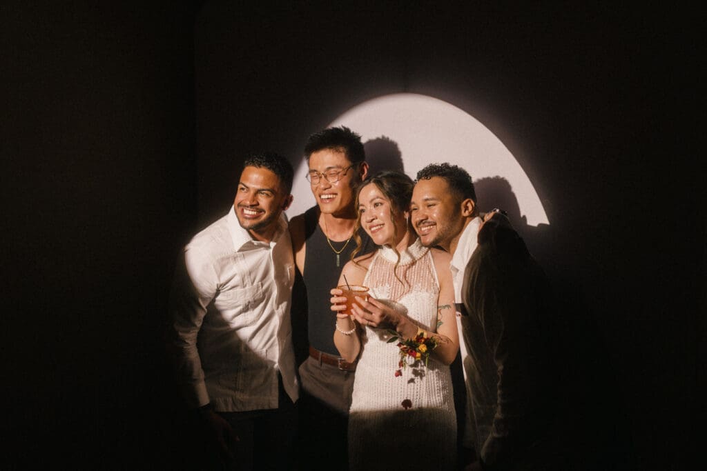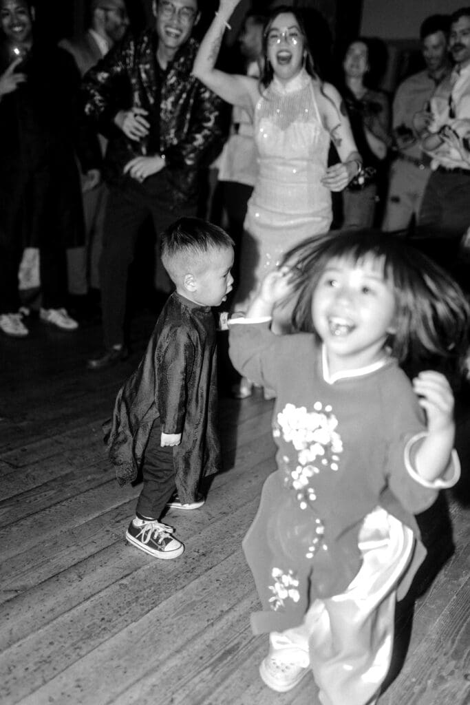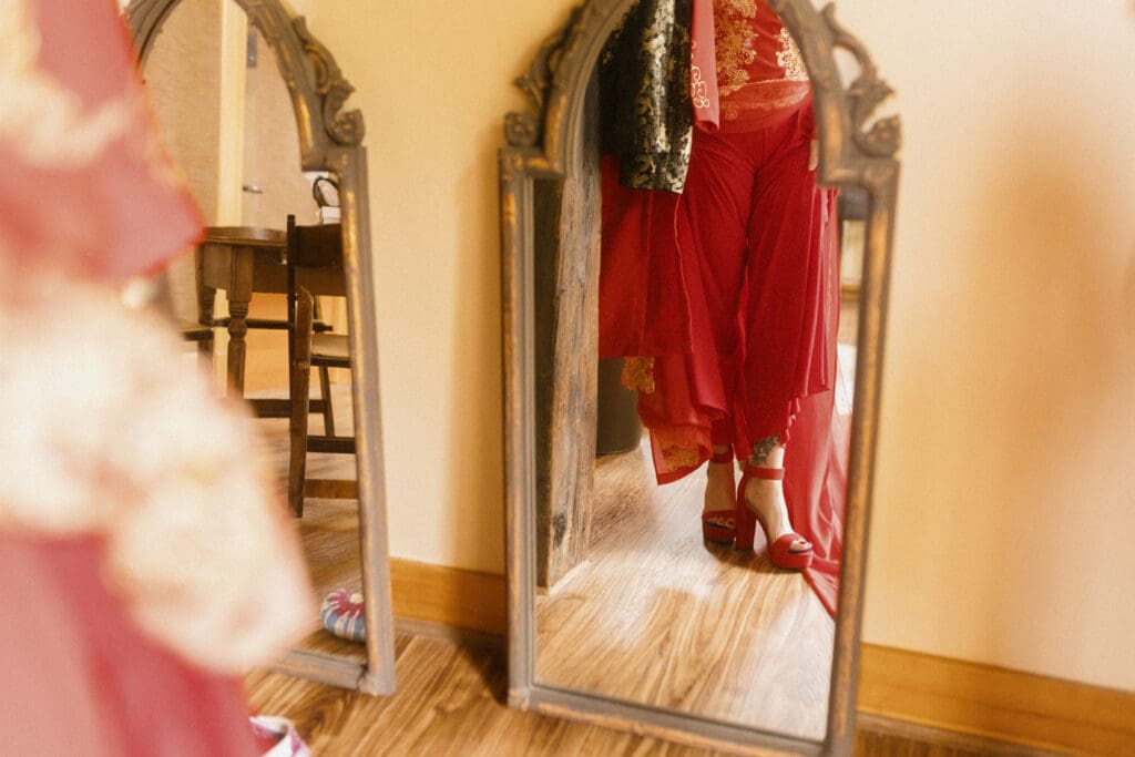 Couple kneeling during their Chinese-Vietnamese tea ceremony at Chase Mill at Tracy Aviary, honoring their parents with traditional gestures of respect.