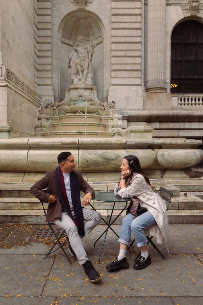 We started our session at NYPL, and the architecture alone brings such a timeless, cinematic feeling to photos. Even though it was busy, we were still able to create images that felt intimate like it was just the two of them in their own world. Tei and Neil have such a calm, grounded energy together, and I wanted the photos to reflect that softness and steadiness. While my photography is inspired by nostalgia, my work is rooted in connection. I’m always paying attention to how a couple naturally interacts: how they stand close, how they laugh, how they settle into each other, and I guide in a way that brings out what’s already there instead of forcing moments that don’t fit.