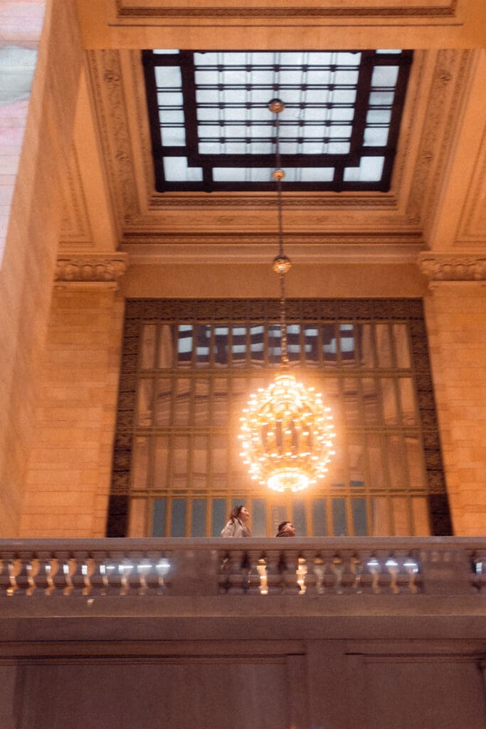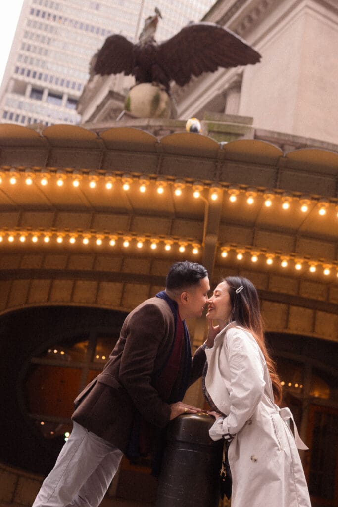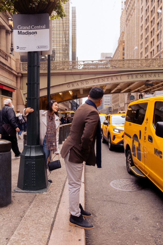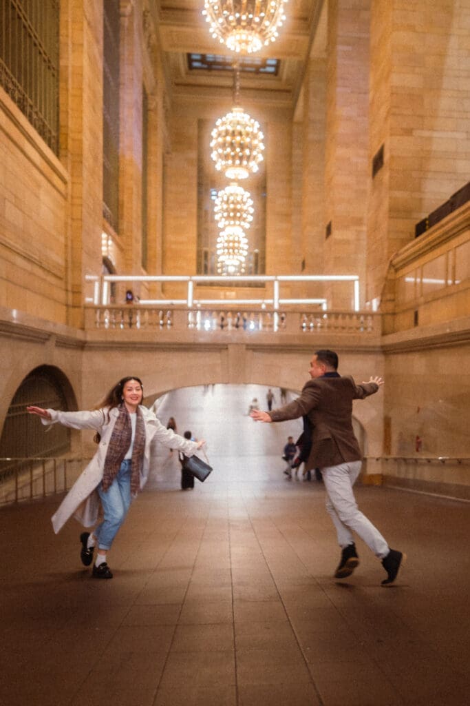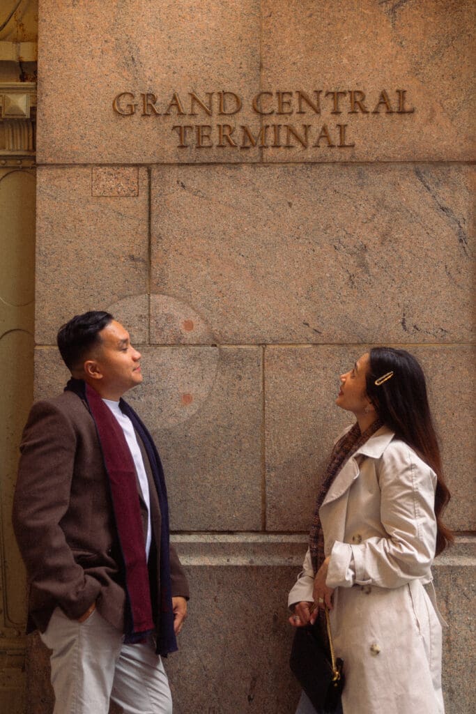 After NYPL, we walked over to Grand Central Terminal for the second half of their session. The energy there is completely different. It was louder and faster, so I shifted my prompts to be more playful and carefree while still keeping the romance present. And the contrast worked beautifully. The motion, the crowds, and the historic architecture added layers of story and nostalgia that made the images feel alive.